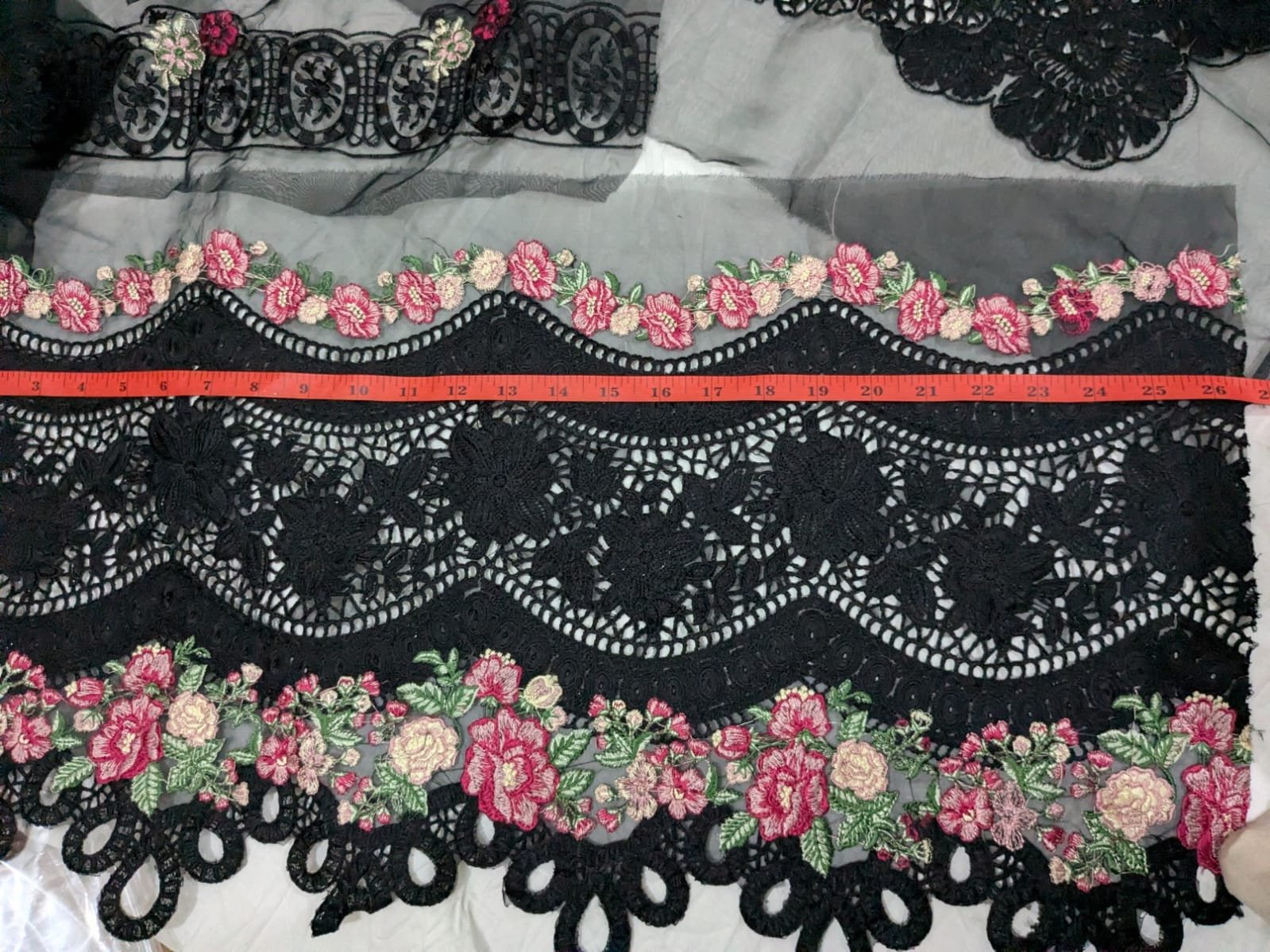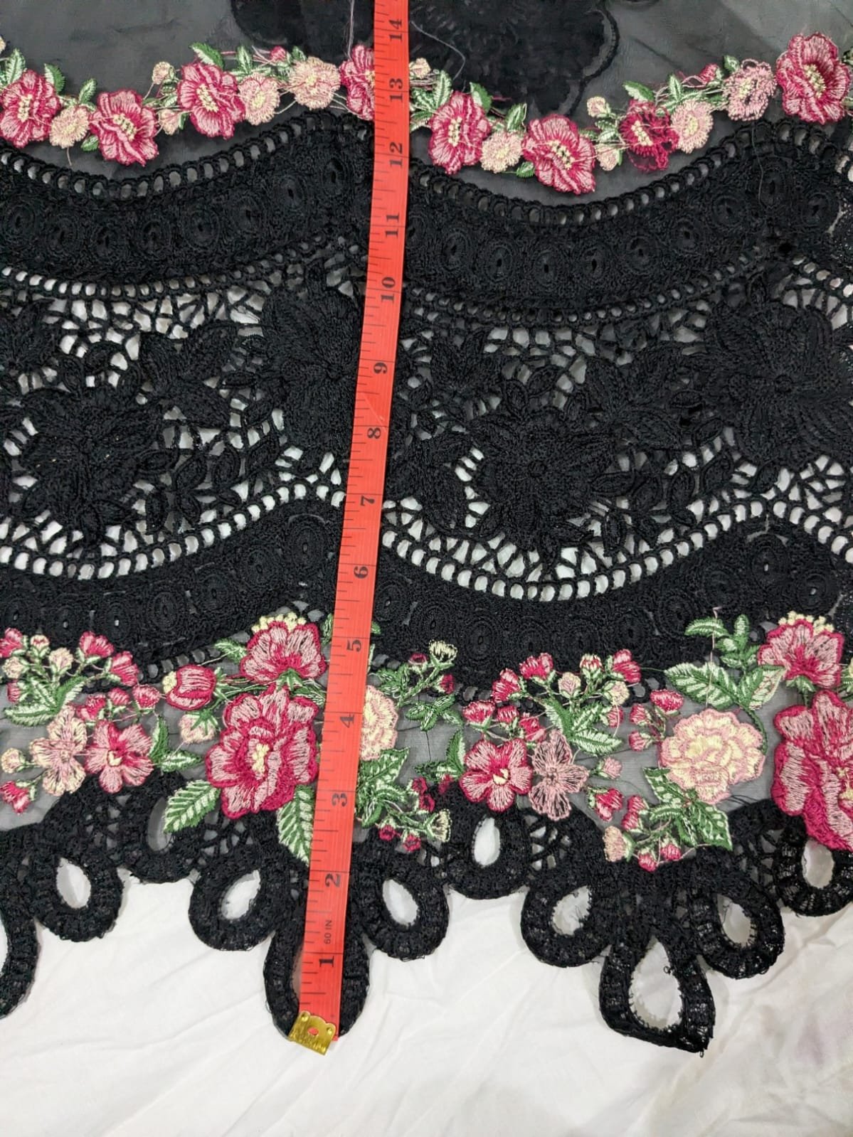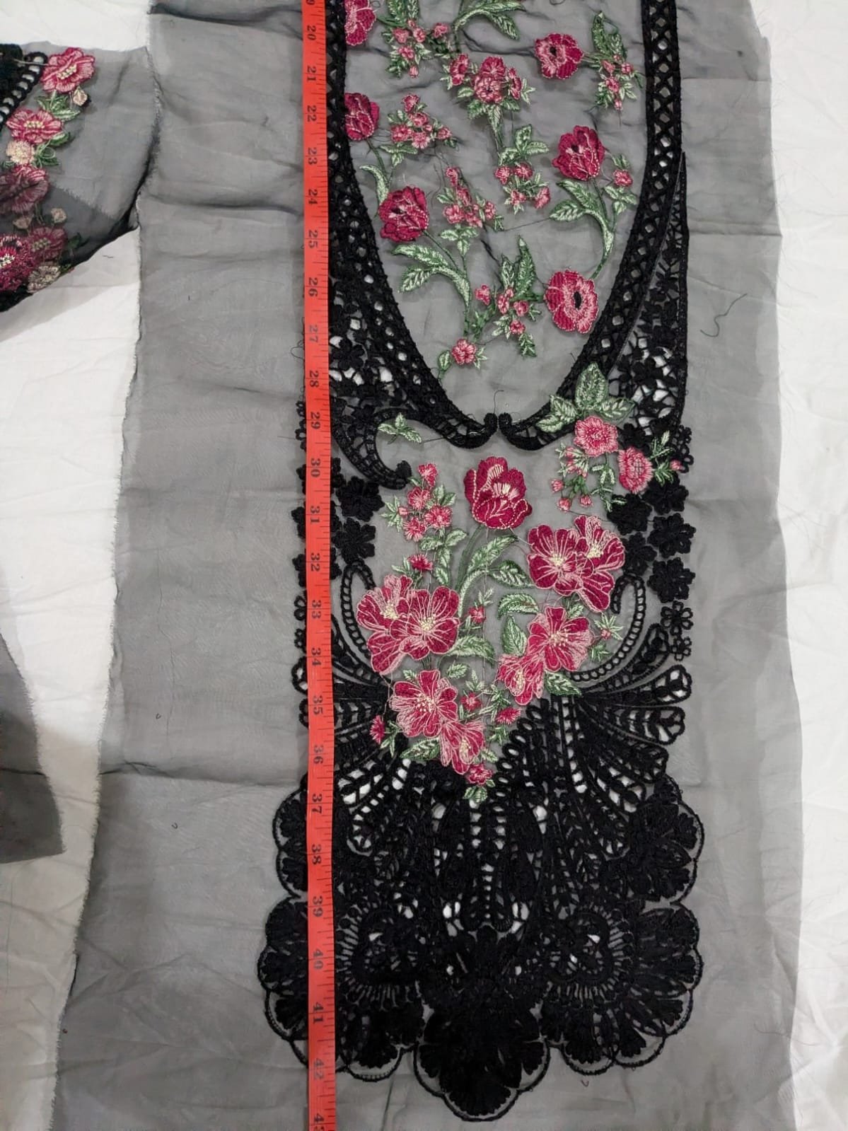 27 inch damn cutting 14 inch broad damn 42 inch long damn 1.5 Yard back and seleves border Black multi fully Lazer cut and heavily embroidered